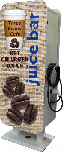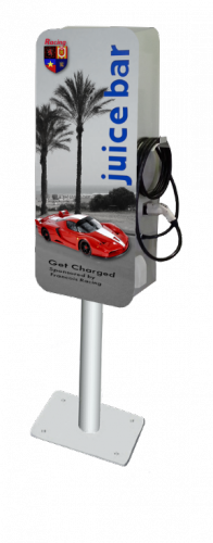 The Juice Bar design allows owners many different options to customize their Juice Bar, including room for advertising opportunities. Collect one time or monthly add revenue by selling advertising on your charging station. Advertising on your Juice Bar allows you to share in promoting an environmentally friendly product with other brands, with the potential to cover the cost of ownership and to create an income-producing asset. As a Juice Bar owner, you also decide whether you want to charge the consumer for the Juice, or provide it as a free amenity. Both the advertising model and the payment options can transform this user amenity into a cash flow positive revenue generating opportunity.